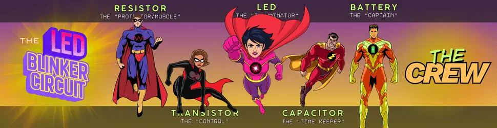 It’s a simple example of components working together as a team to create behavior that none of them can do alone. The following are the items we’ll need to accomplish our goal. Let’s meet the crew of The Circuit Squad.