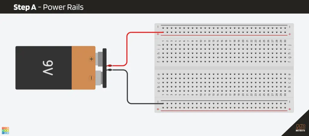 - Connect the 9V battery + to the red rail on the breadboard.