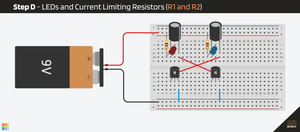 Step D – LEDs and Current-Limiting Resistors (R1 and R2)