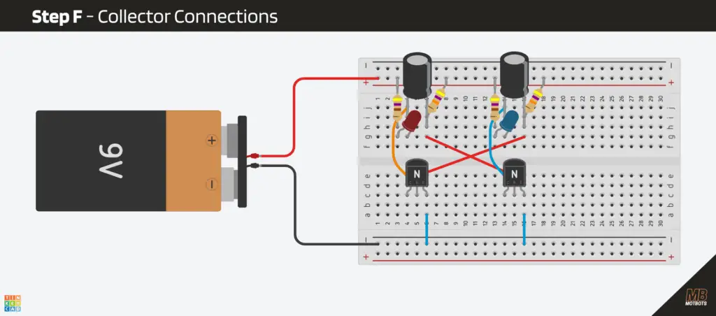 To finish off our timing networks, we need to make the final connections to the collectors of each transistor.