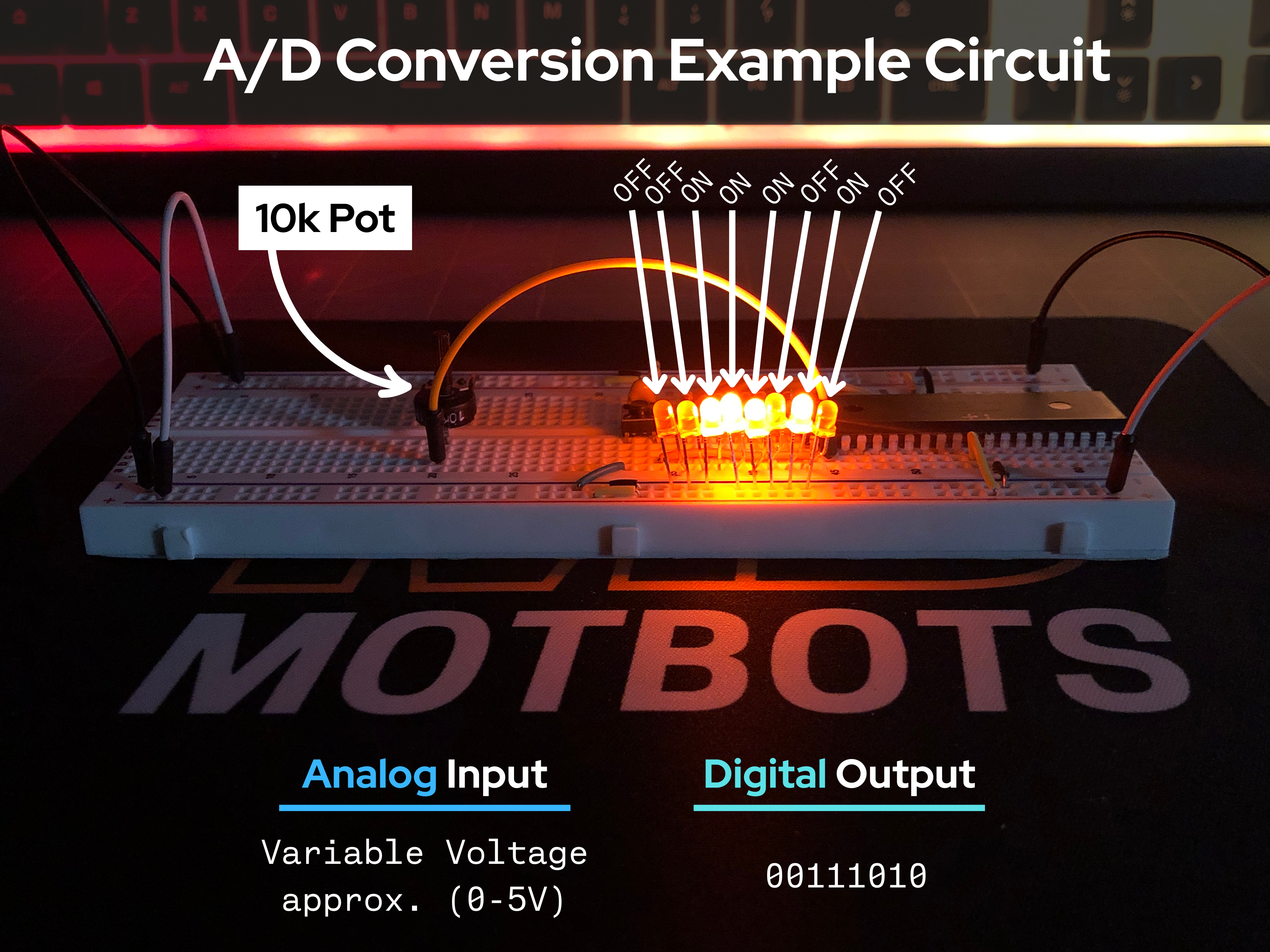 - That digital signal will be processed and output through 8 pins to 8 corresponding LEDs in the circuit that will provide a sequence of binary values telling each of those LEDs to either be turned on or off. This will give a visual representation of the analog input value in an illuminated digital binary form.
