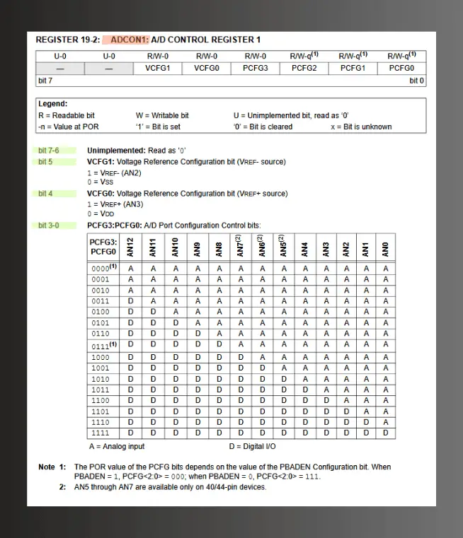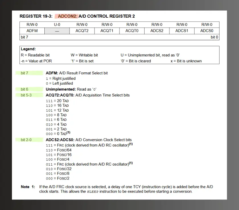 Let’s thoroughly walk through how one should set the bits for the ADCON2 control register for the purpose of setting up a PIC for using an analog input: