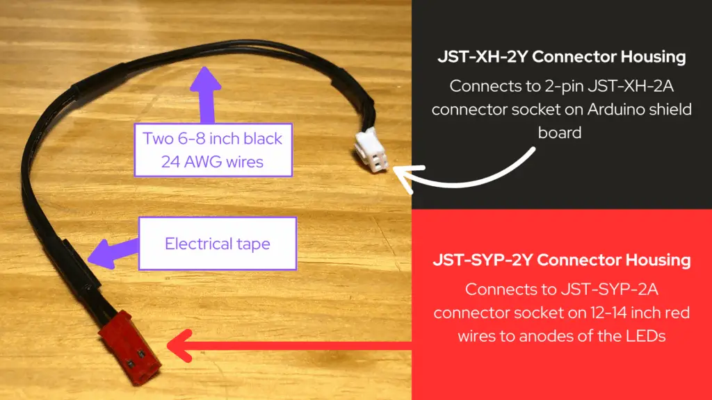 In the video below, Step 8 begins with us creating the connectors for the anodes of the LEDs (of which we’ll get to next, here in Step 8). I had somehow forgotten to record making the 2-wire connector we need for connecting to the PCB shield board at the JST-XH-2A connector socket we soldered to the board in Step 6, which is also to connect to the anodes of the LEDs. The following is how to create the simple 2-wire connector we need first, which should have been part of Step 8, but again, this part was not recorded on video.