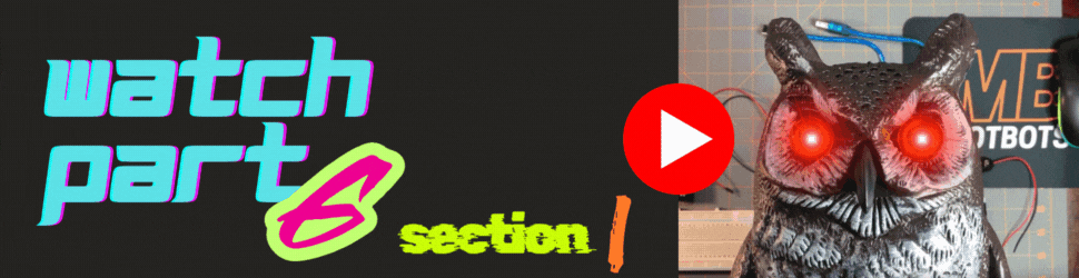 This has been Part 6 – Section 1, of the build for the OwlBot project. We started off this project doing the basic work of making connections on the breadboard. In Part 1, we made connections for the PIR sensor and Arduino. In Part 2, we added the DFPlayer Pro Mini MP3 Player to our setup. Then, we added the OwlBot’s flashing red LED eyes to our breadboard prototype, in Part 3. In Part 4, we upgraded the power supply, and most recently, in Part 5, we gave our OwlBot mechanical movement by adding a couple of solenoids and a DC motor to our breadboard prototype circuit. All the while updating our code for the Arduino as we expanded the OwlBot’s capabilities.