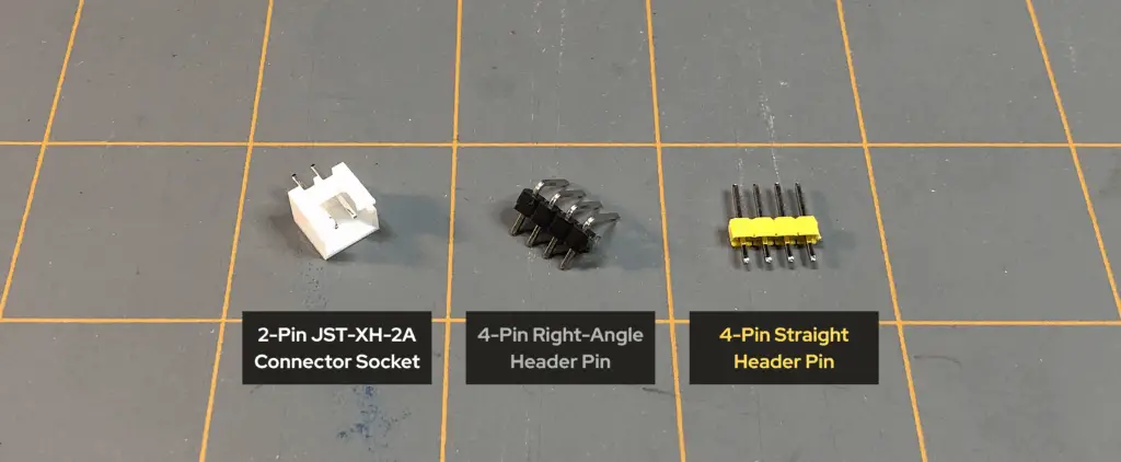 - A 2-pin JST-XH-2A connector socket to make a connection to the Arduino prototype shield board at the two 680Ω resistors where the LED wiring assembly will connect to that we’ll make later in the build.