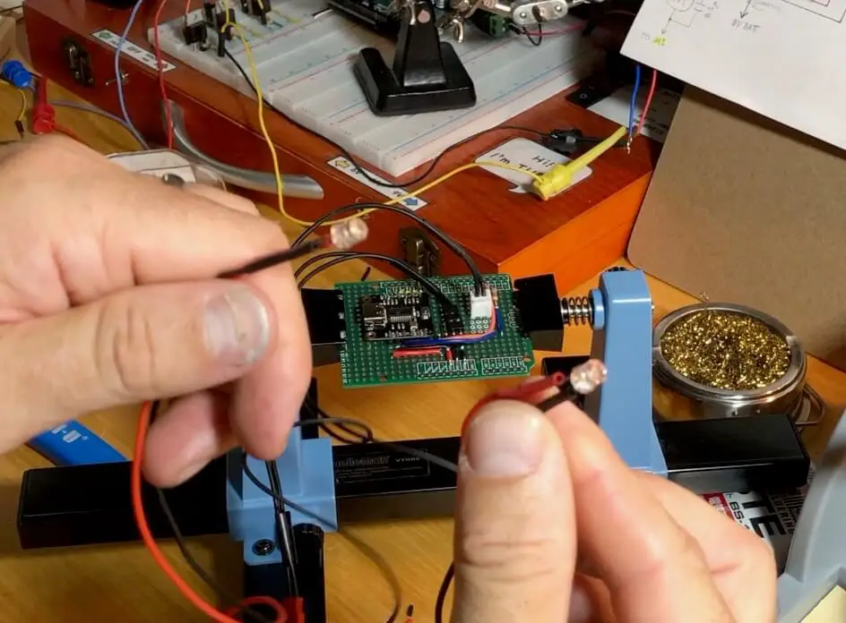 - Next, tin the anodes of the two LEDs we are using from Part 3 of the OwlBot project series.