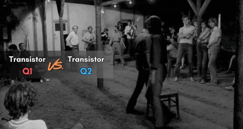 That runner gets one tiny step ahead, and then suddenly throws a giant wall across the other runner’s lane, forcing the other to stop dead. That “giant wall” is the capacitor pulling the other transistor’s base down.