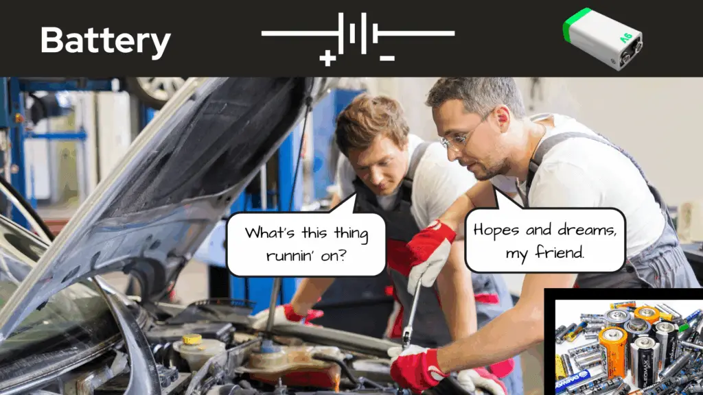 Keeping with the road theme, we can think of the battery as the engine for the electrons to move throughout the circuit. I know, I know — cars have a battery for ignition purposes and to power their electronics, but let’s just think of the battery of a circuit as being the circuit’s engine, okay? Work with me here.