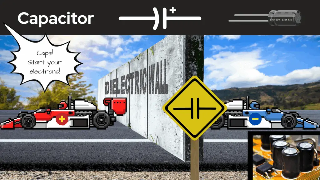 It was difficult to come up with a road themed analogy for the capacitor, but on our page What is a Circuit?, an analogy was made for a new racetrack game that our race car drivers made. The race included a concrete wall on the track, and that concrete wall was used as the analogy for a capacitor. I highly suggest you go check that analogy out to hopefully better understand what a capacitor does.