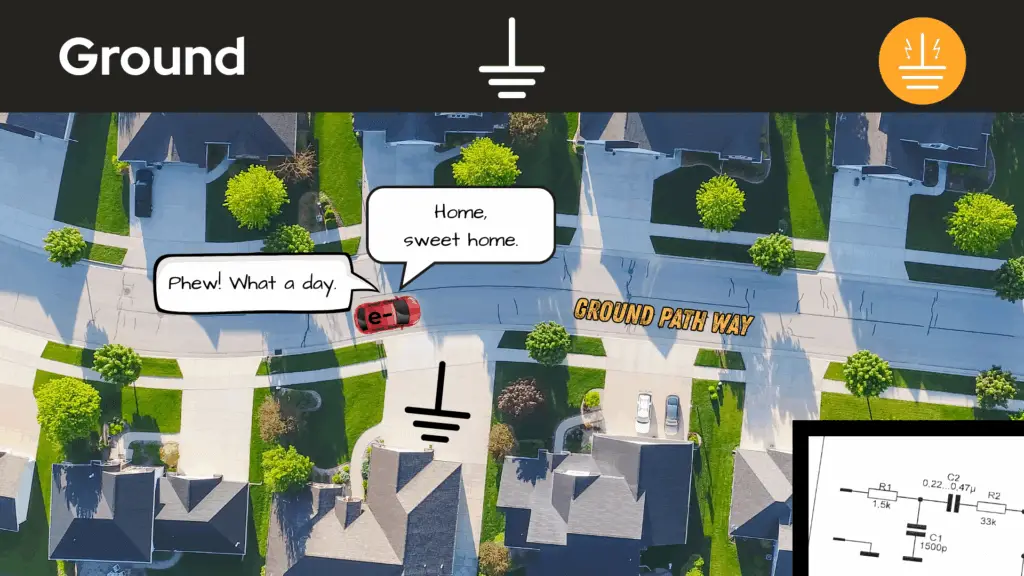 Keeping with using the road theme, we can think of ground as the road back home. Electrons leave home for work for the day — doing the rat-race throughout the circuit — then, come back home for the night.