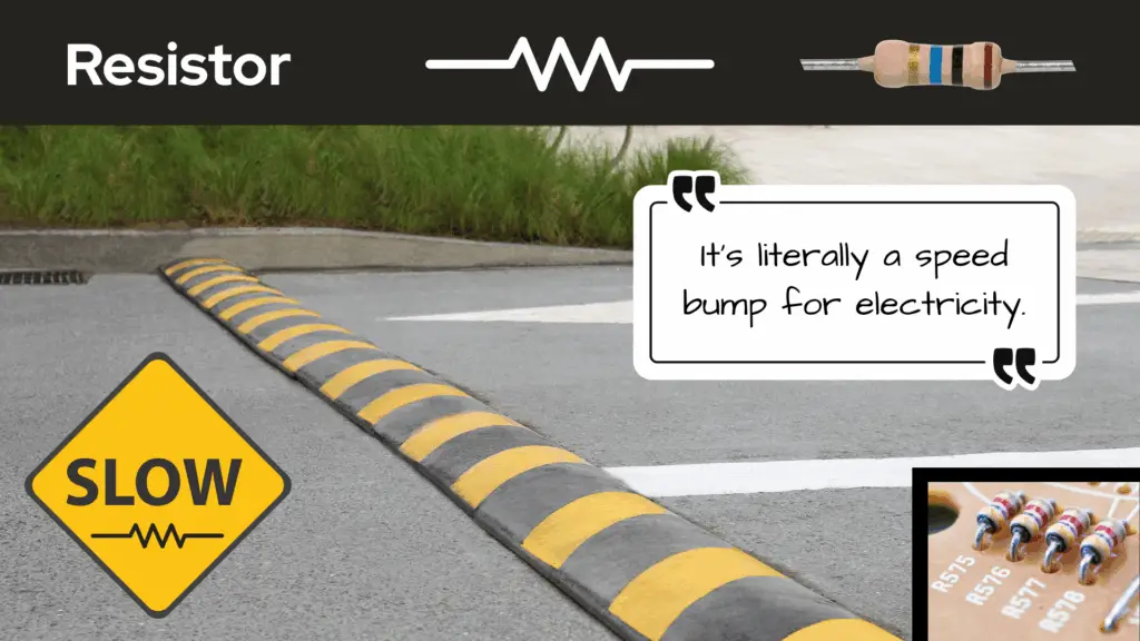 Resistors oppose the flow of current, so you can imagine that if you had to drive through several speed bumps, they’d be impeding your ability to travel more freely through that section of road you’re “flowing” through.