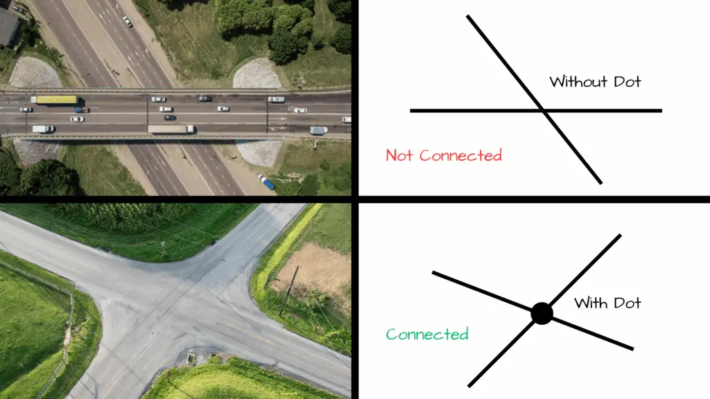 - When two lines cross without a dot, they don’t connect — they’re just passing each other.