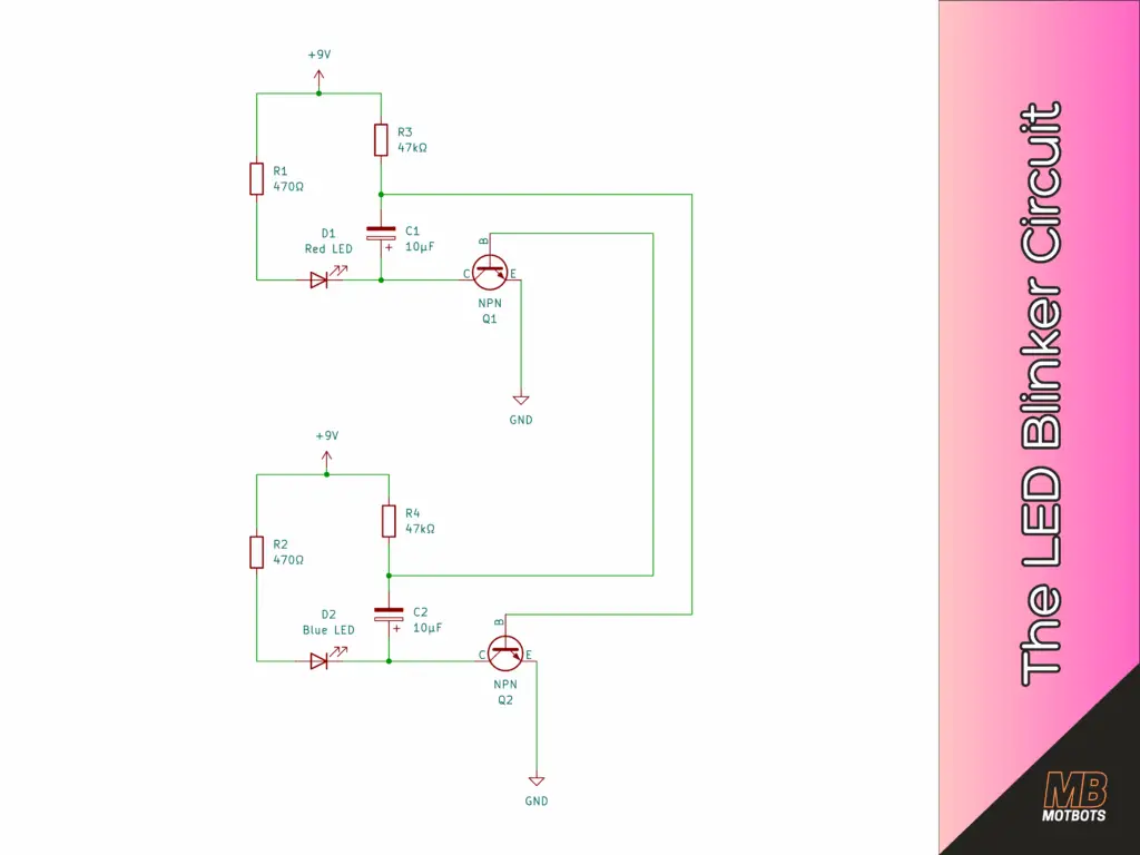 Referencing the schematic diagram of the LED blinker circuit provided above — the circuit uses two transistors, two capacitors, and four resistors to create a little electronic argument: