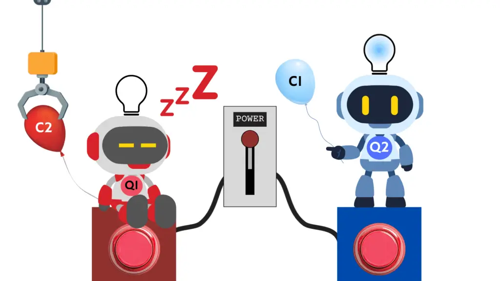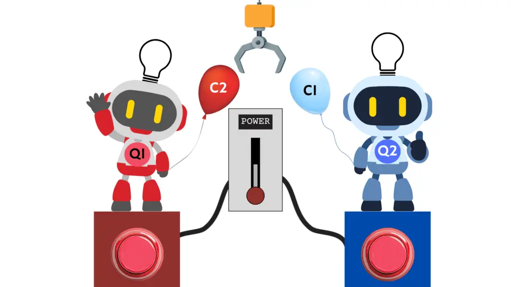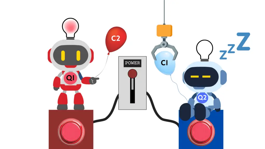 Imagine you have two little robots. One robot’s name is Q1, and the other robot’s name is Q2. Each robot has: